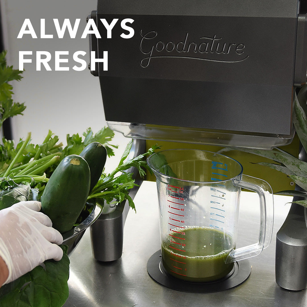 Our Juices are made with a REAL hydraulic juice press. This extraordinary cold-pressing technology retains the maximum amount of life force and nutrients possible. No heat or cutting of enzymes from centrifugal blending. Always raw! Never blended! Never masticated! Never pasteurized!